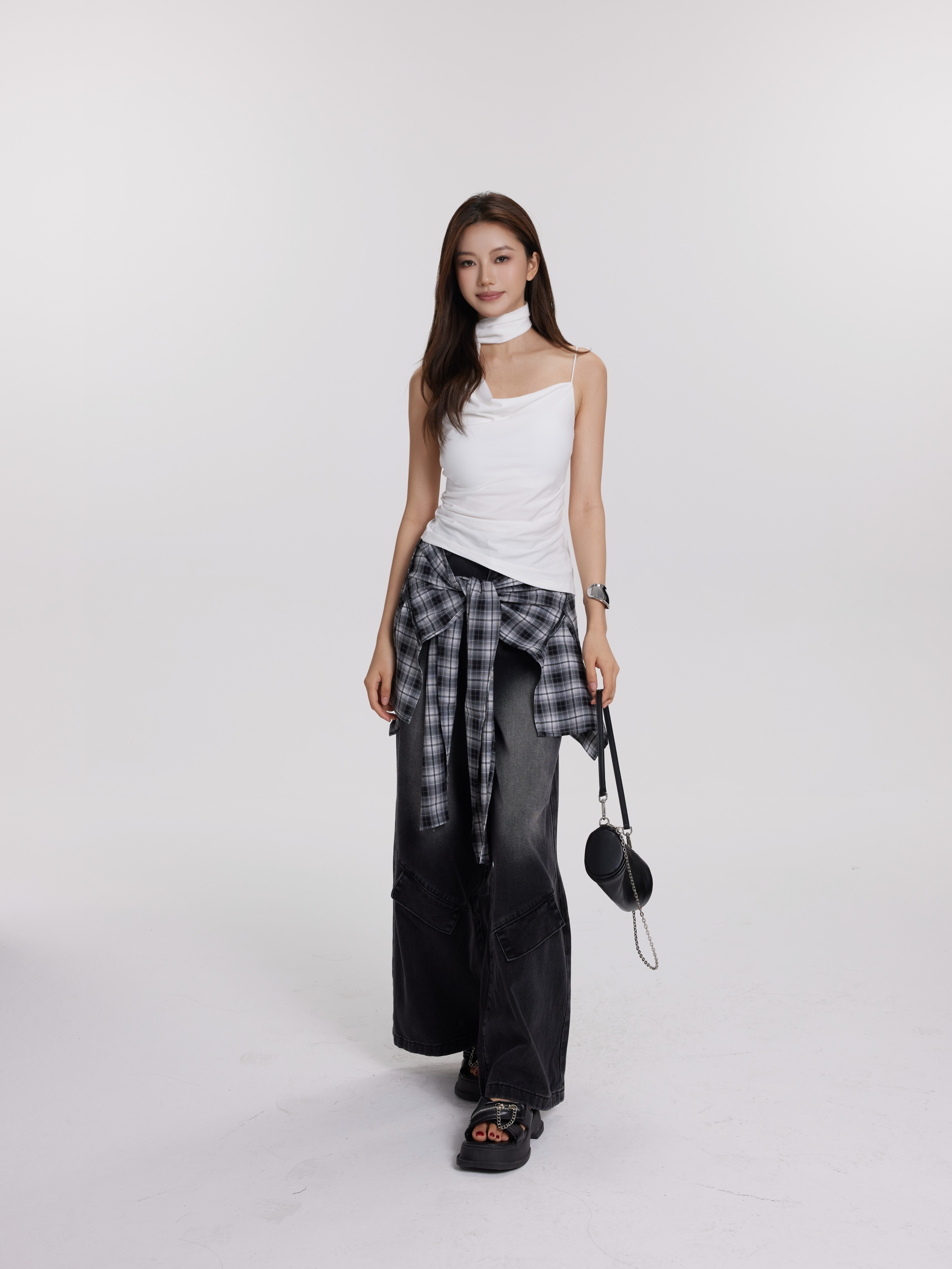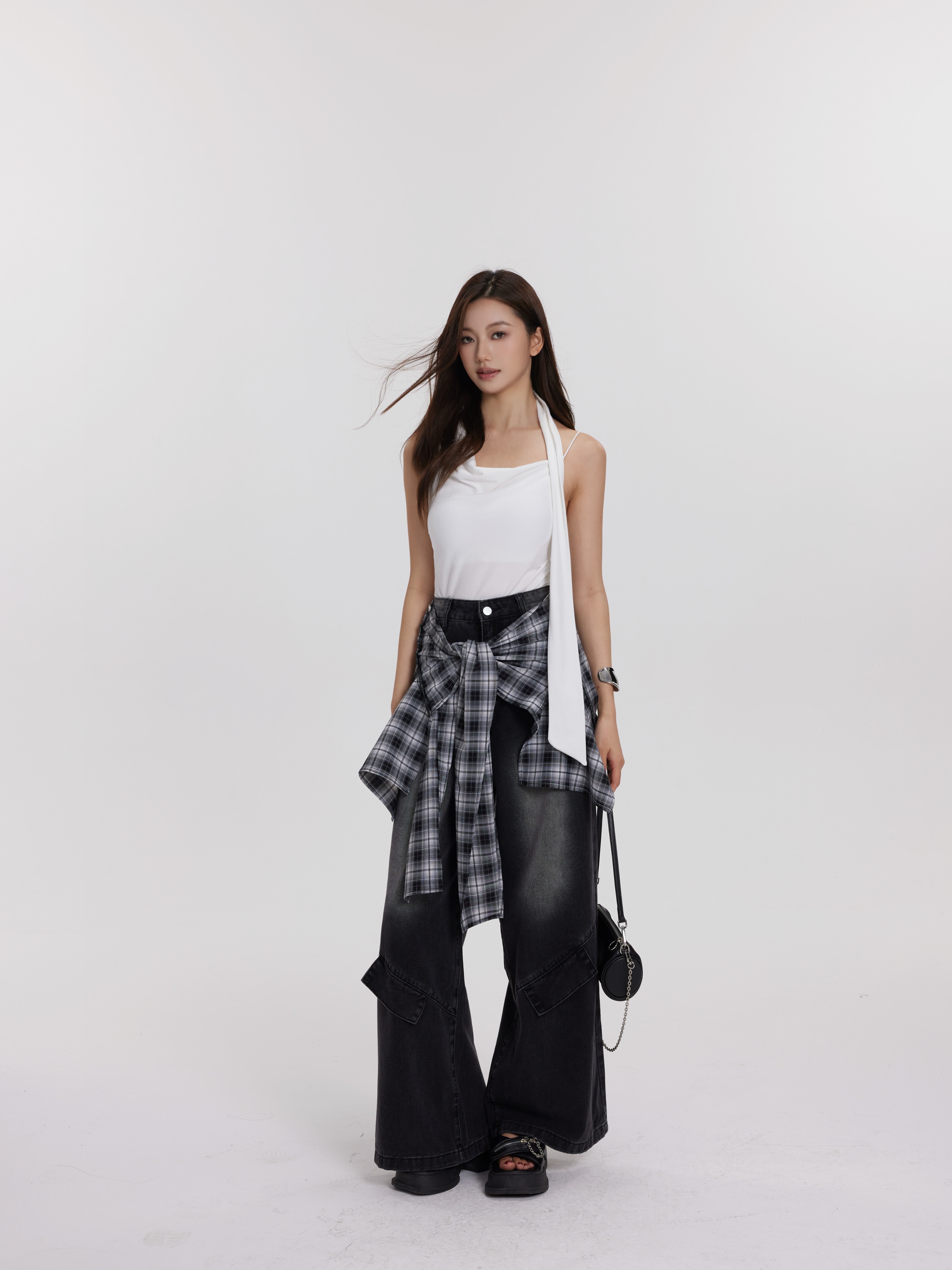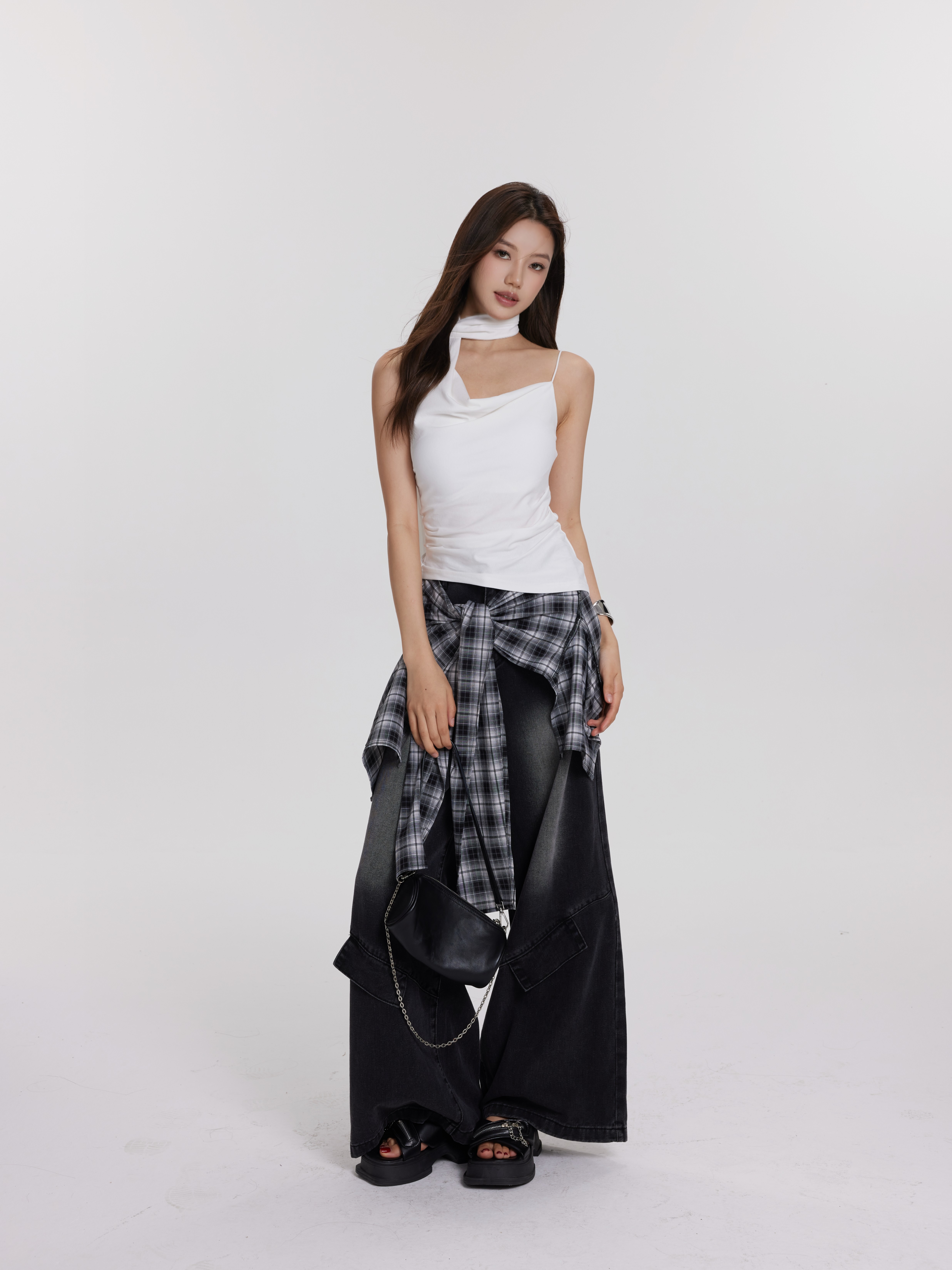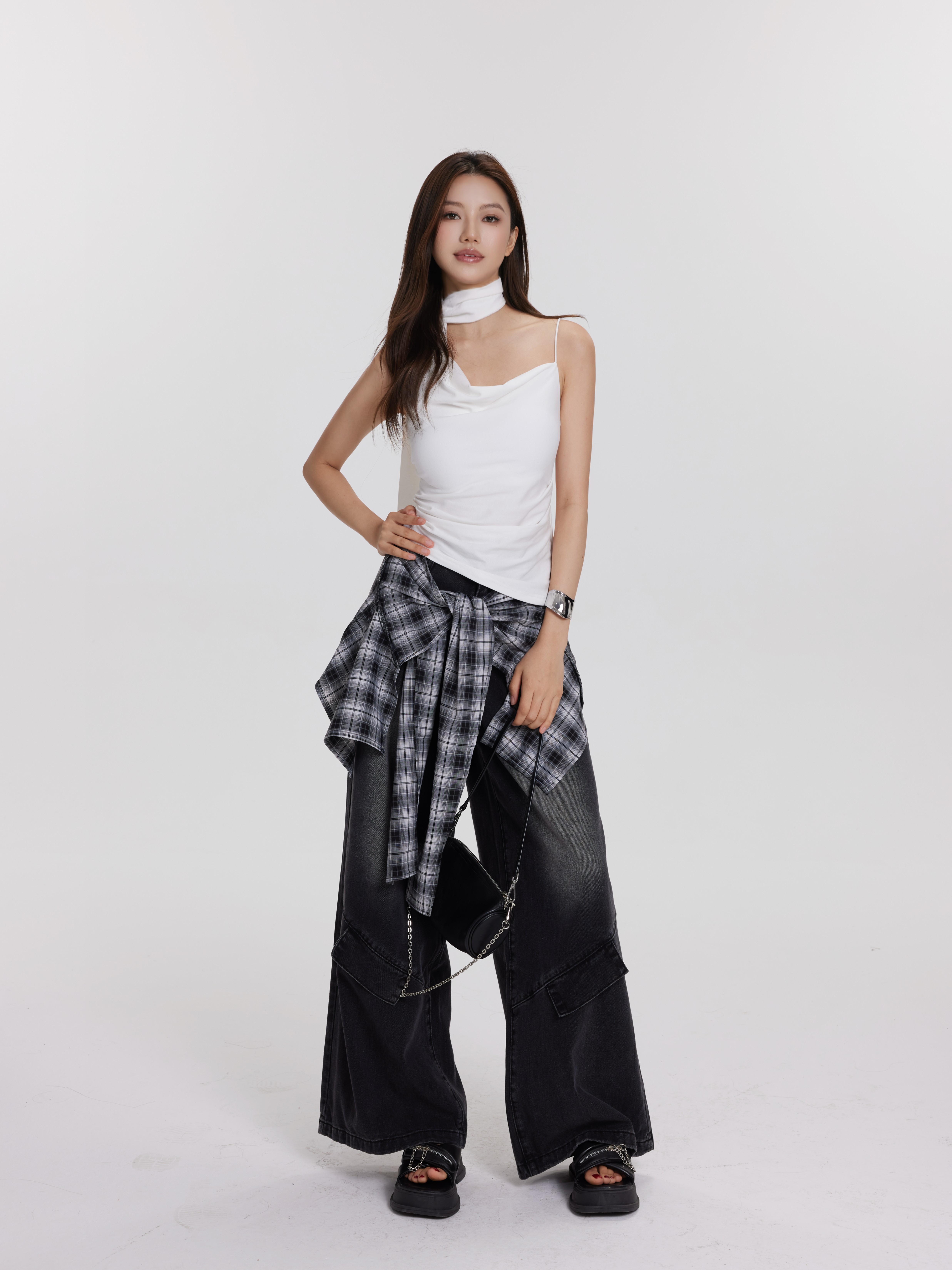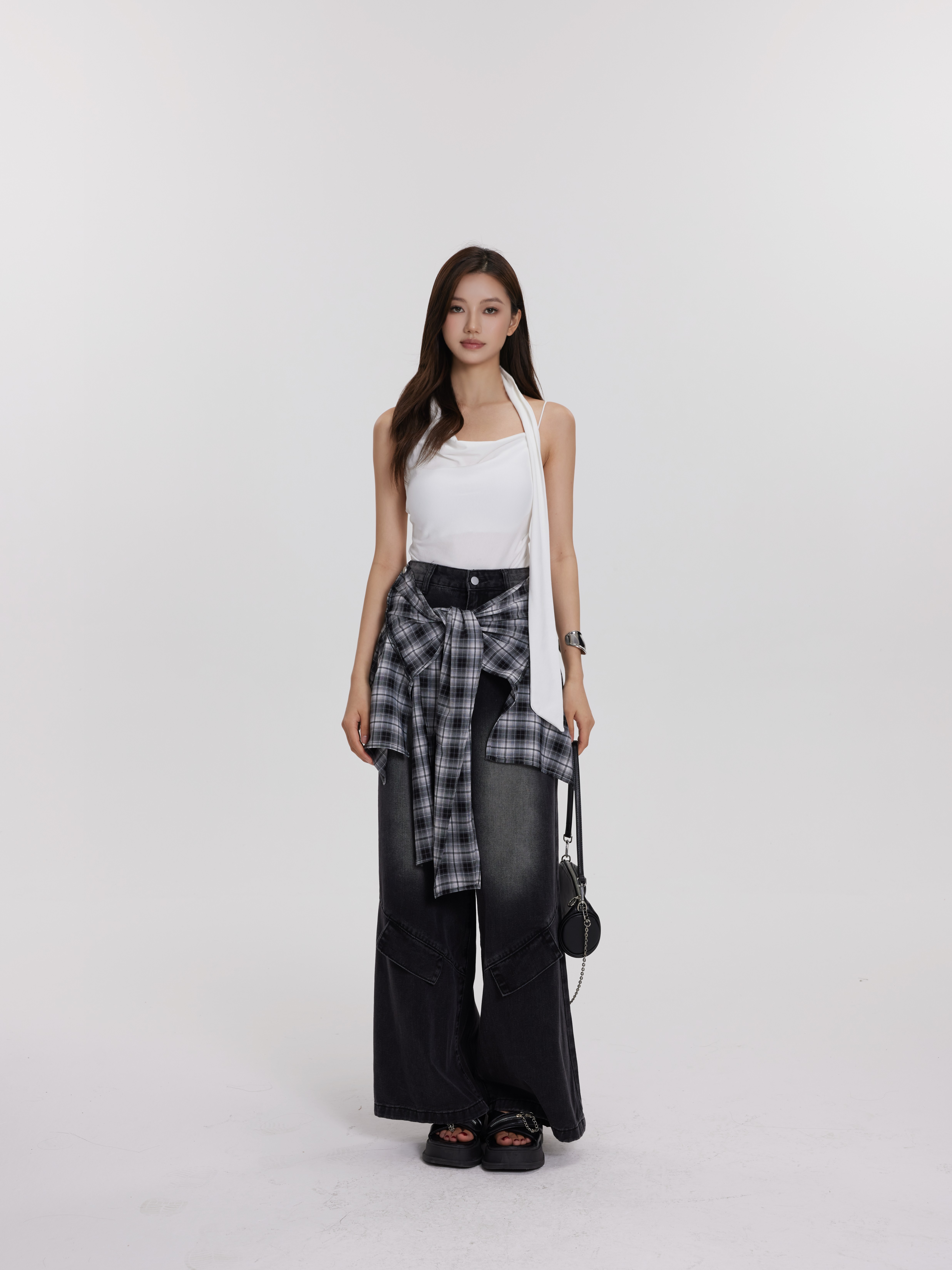 格子牛仔裤 黑灰色 可拆卸