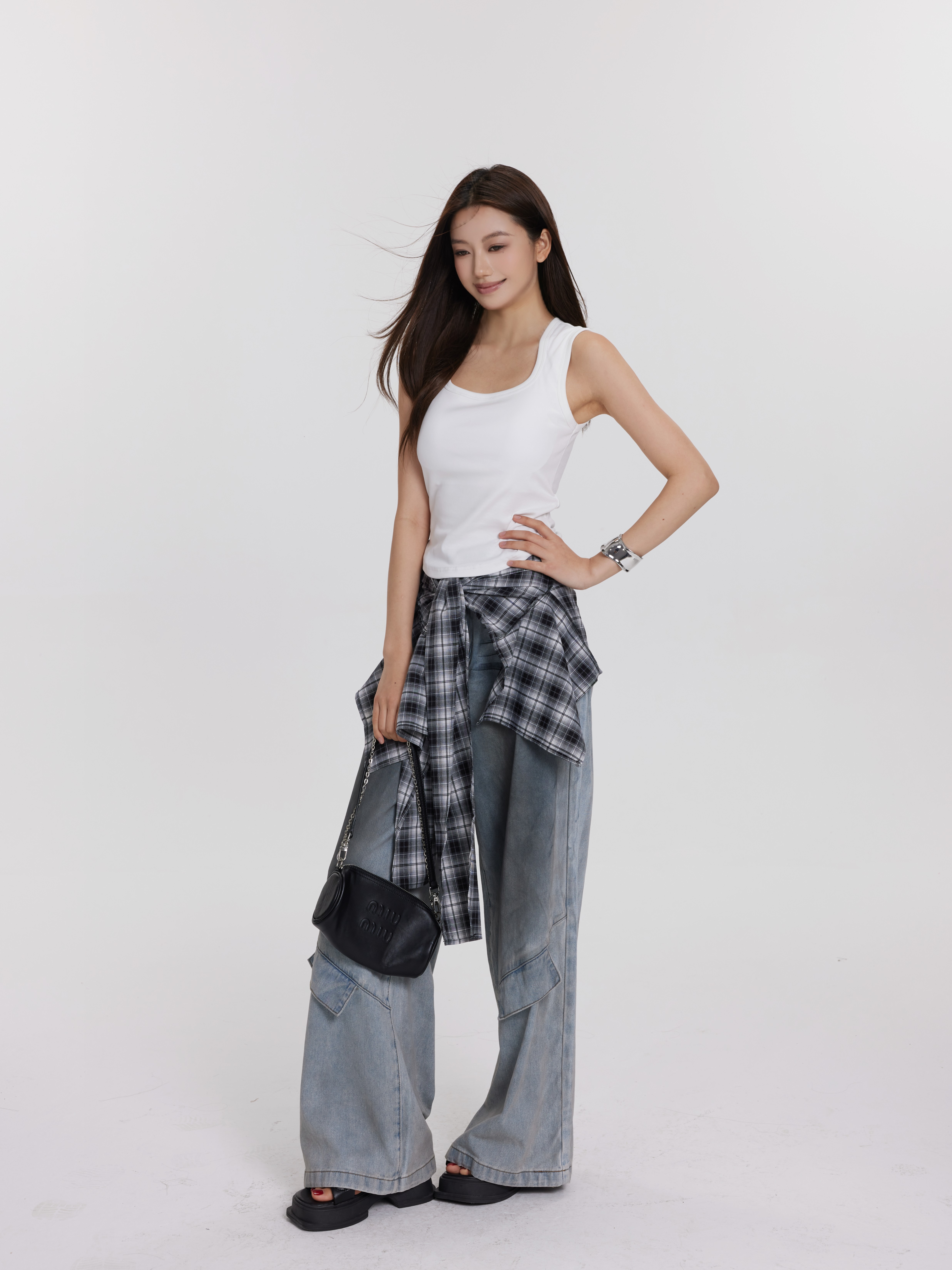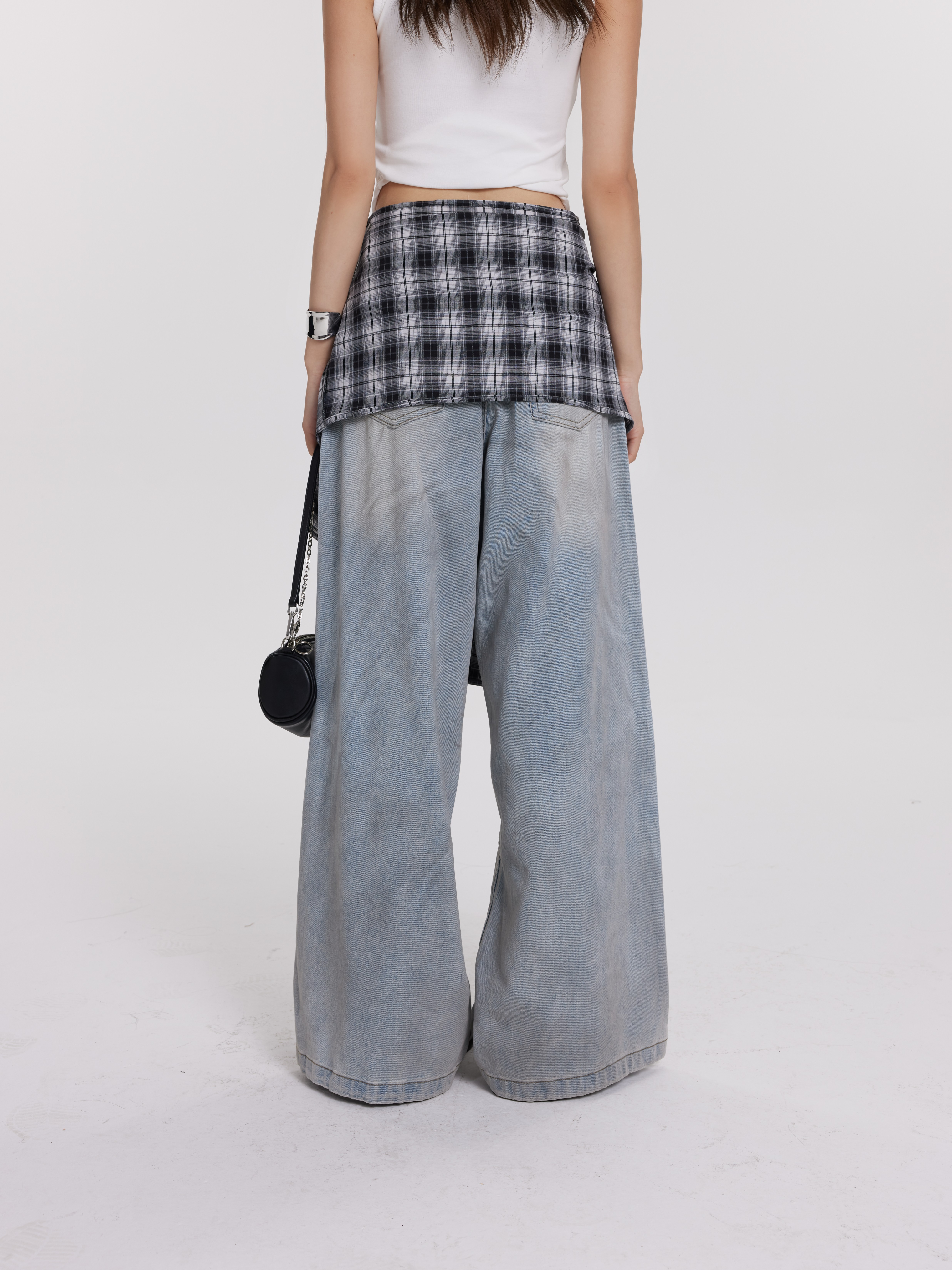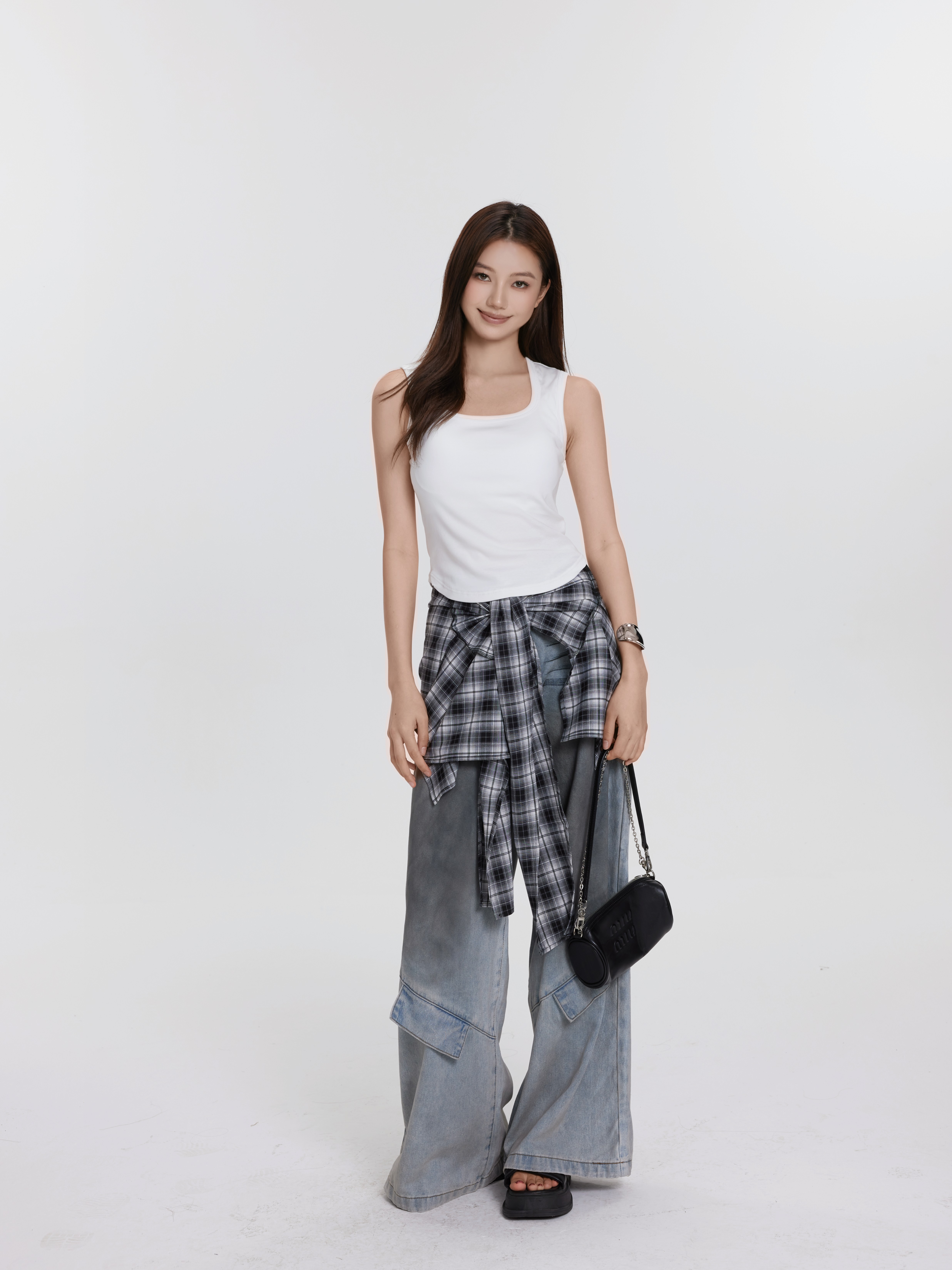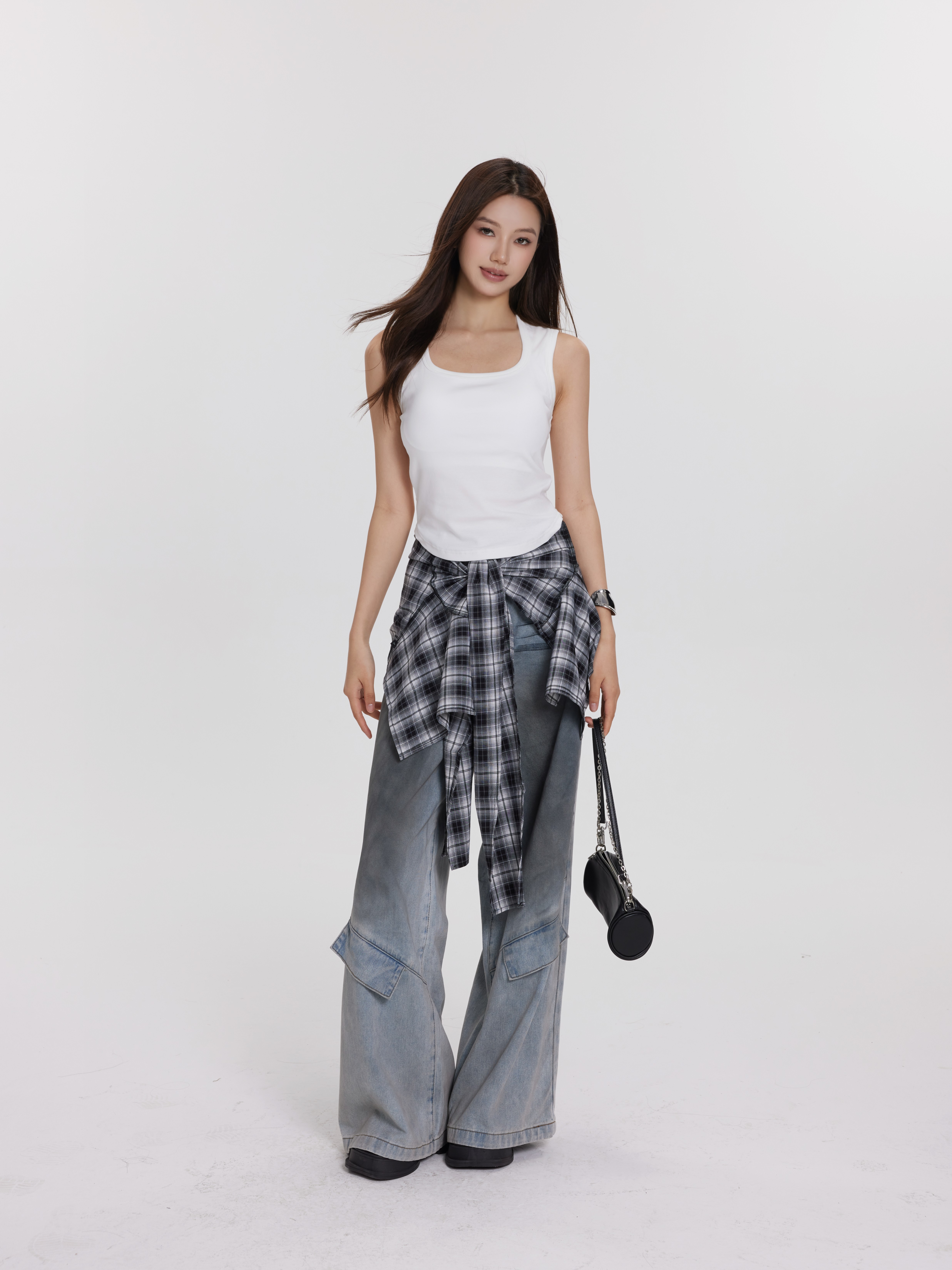 百搭胸垫背心Padded Undershir/拼接格子牛仔直筒裤 蓝色Ddenim Jeans