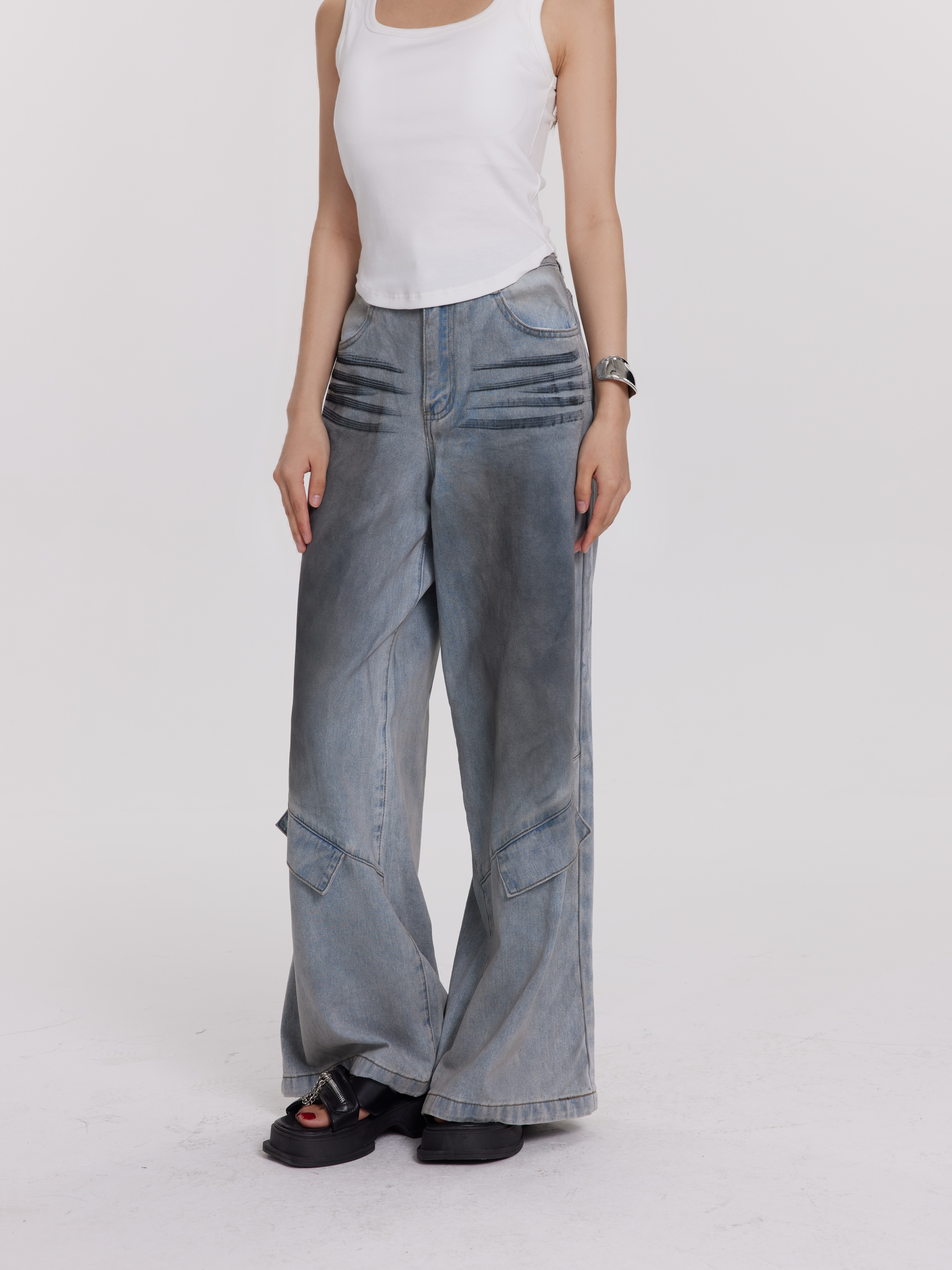 美式水洗作旧款拼接牛仔裤
