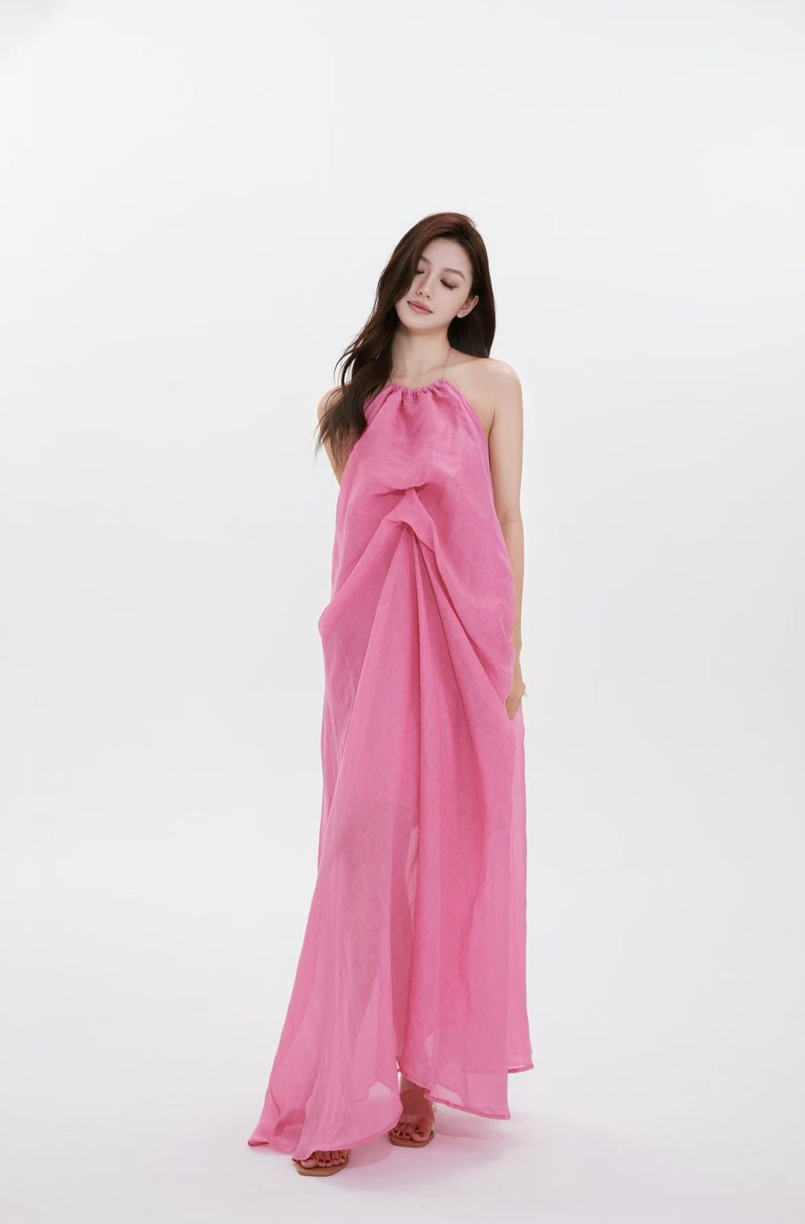 氧气感大美人 大方且恰到好处的露肤 挂脖采用手串珍珠 细节把控 布面呈微光泽 柔软而不失挺阔